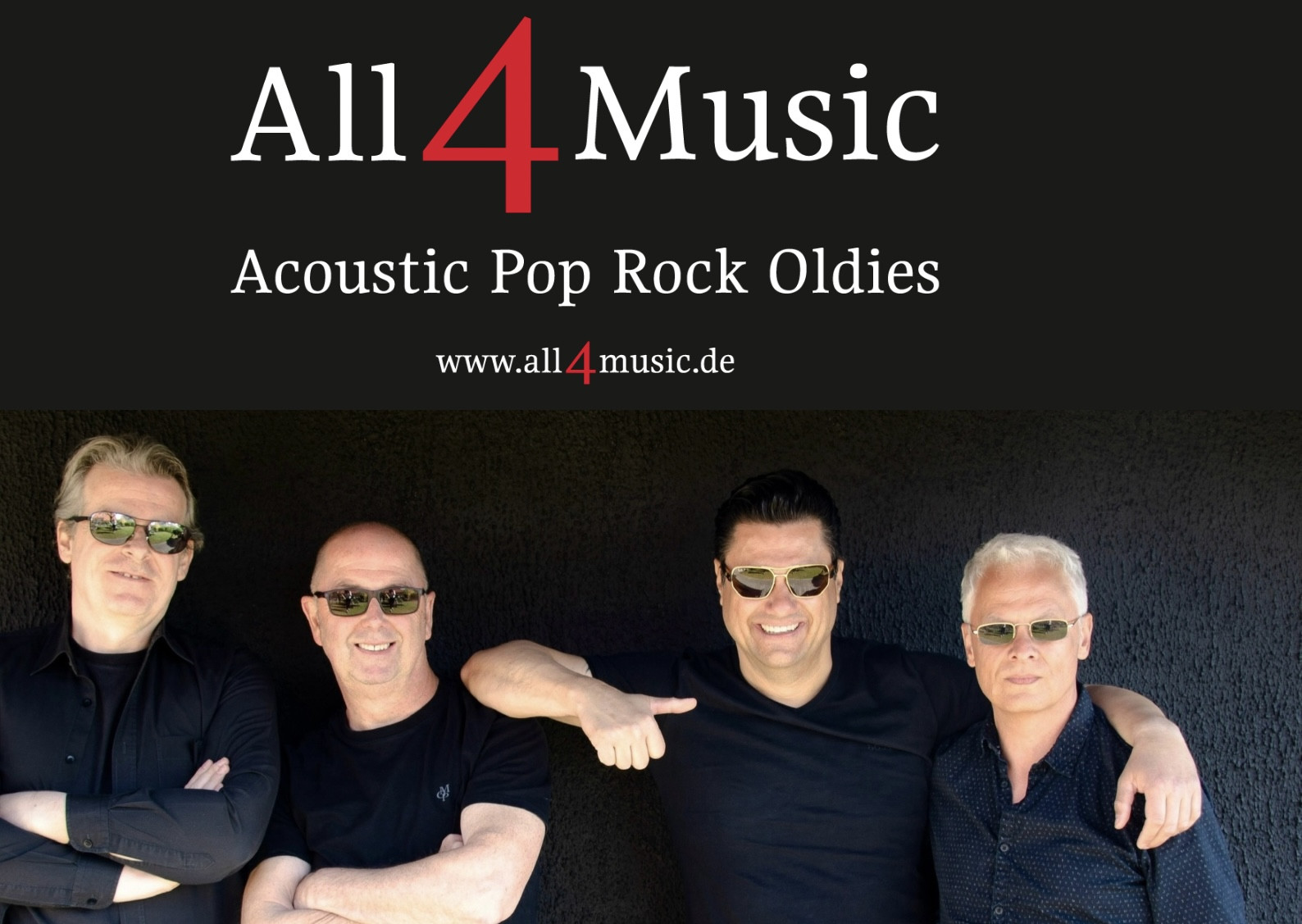 All4 Music - das sind vier Akustikinstrumente, mehrstimmiger Gesang und Songs, die immer funktionieren: Summer of ’69, Sweet Home Alabama, Wonderwall - das ist All4Music. Wer im Saal steht, bleibt selten stehen – Tanzen, Mitsingen und Abfeiern sind ausdrücklich erwünscht.